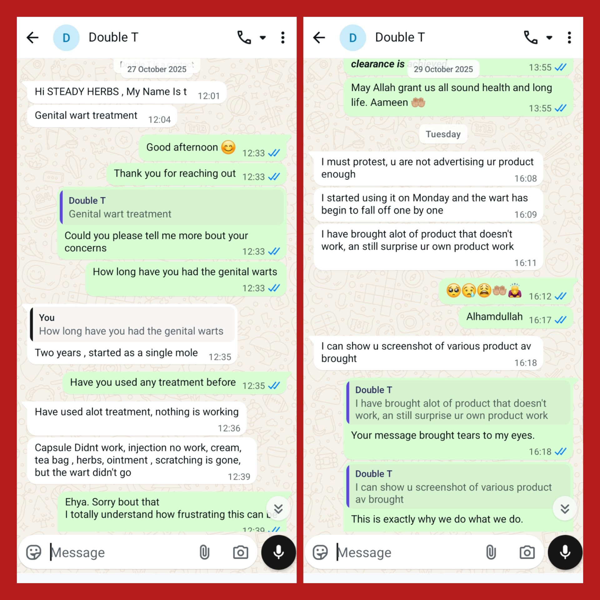 That solution became Steady WartFree Herbal Capsule & Herbal Cream — a tested formula now used by over 1,059+ people, with no recurrence. May He continue to make it effective and beneficial. Aameen.