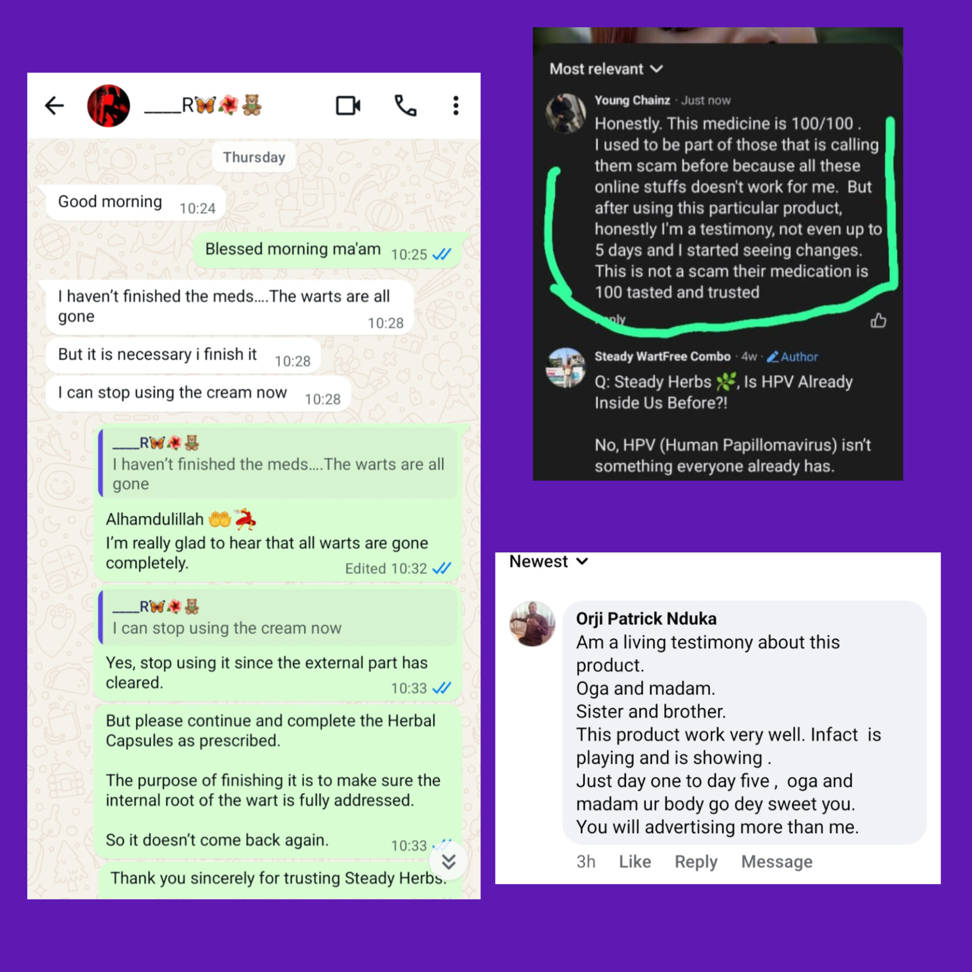 Steady WartFree Combo proven to be the best solution to eradicate genital warts, skin tag, keloid and many more skin problems. With carefully selected medicinal plants with proven antiviral, antibacterial, and skin-repairing properties, offering results you can see and feel.